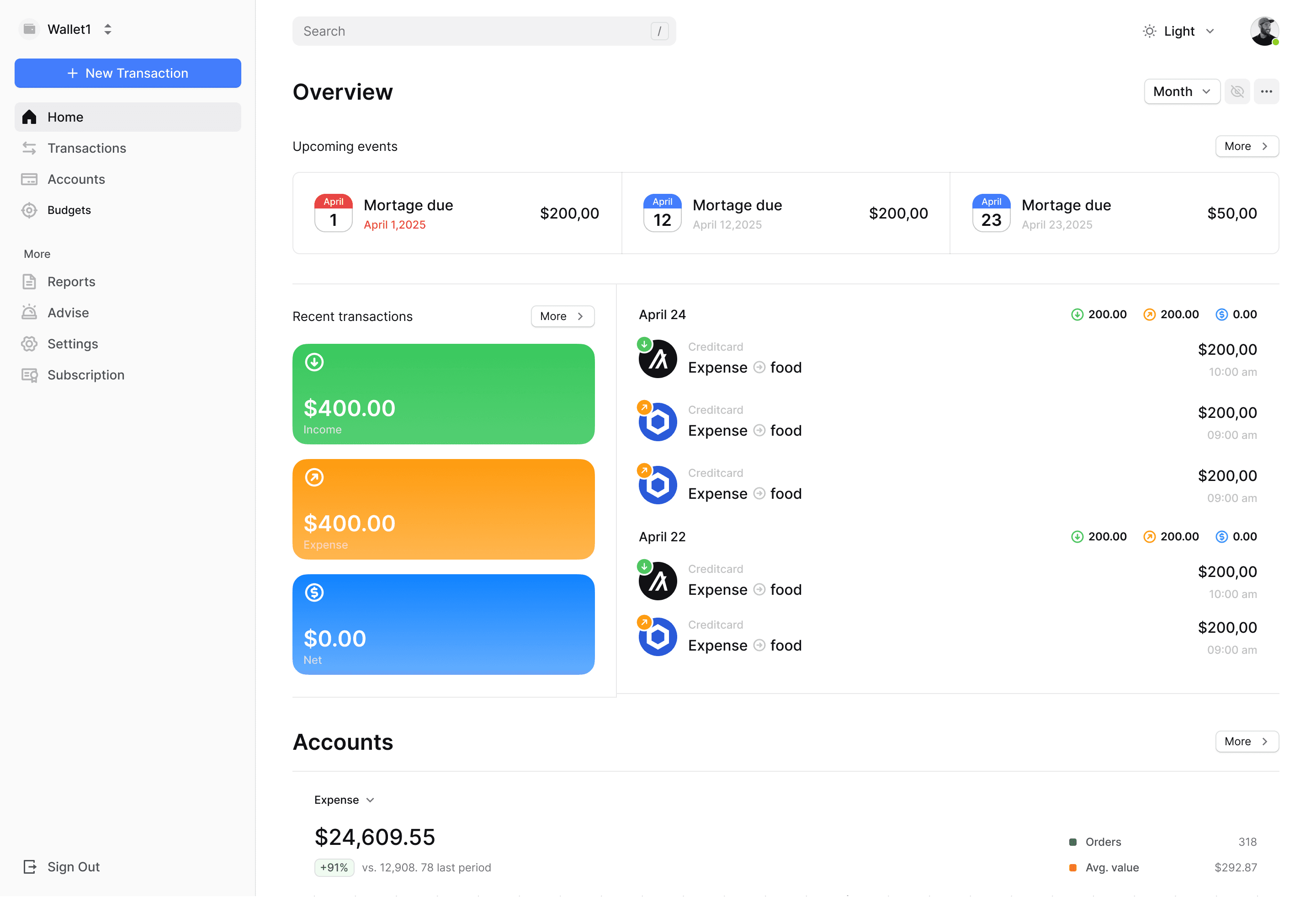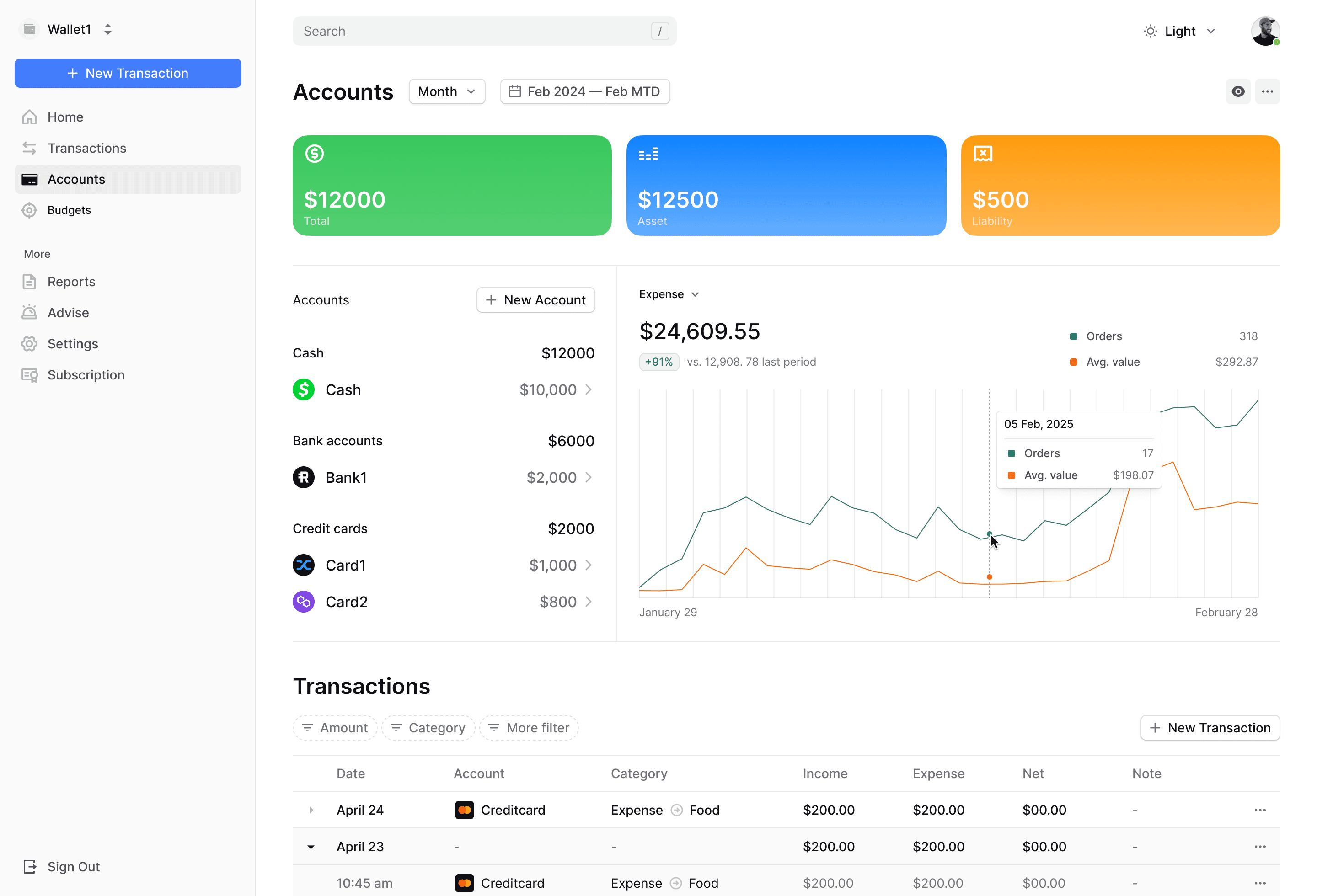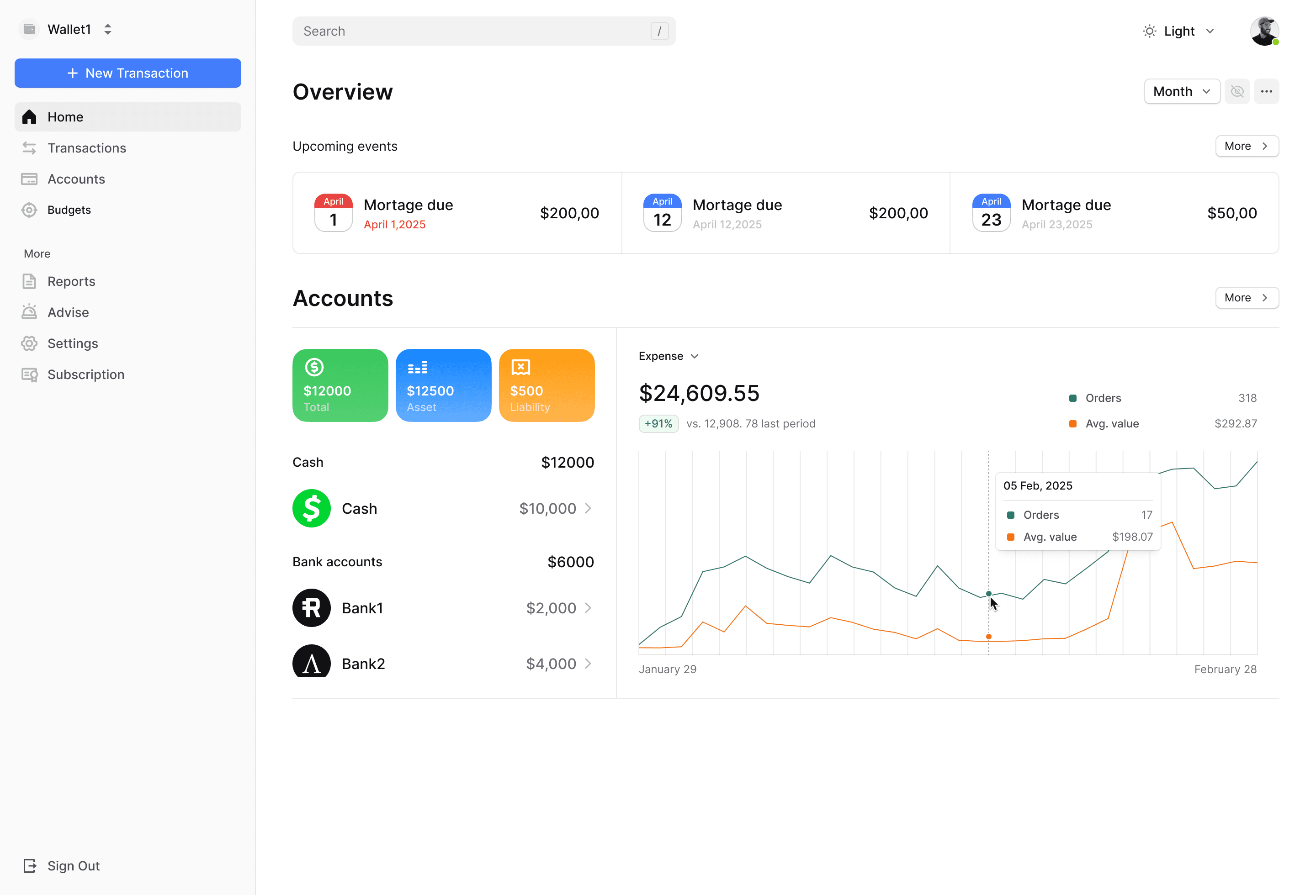 Crafted by experienced product and design experts, Wallet1 is a clean yet powerful financial management tool. It features an intuitive financial dashboard that helps you gain a clear overview of your income, expenses, and upcoming bills. With its innovative account and transaction visualization, Wallet1 helps you stay on top of your finances and provides a complete view of your money.